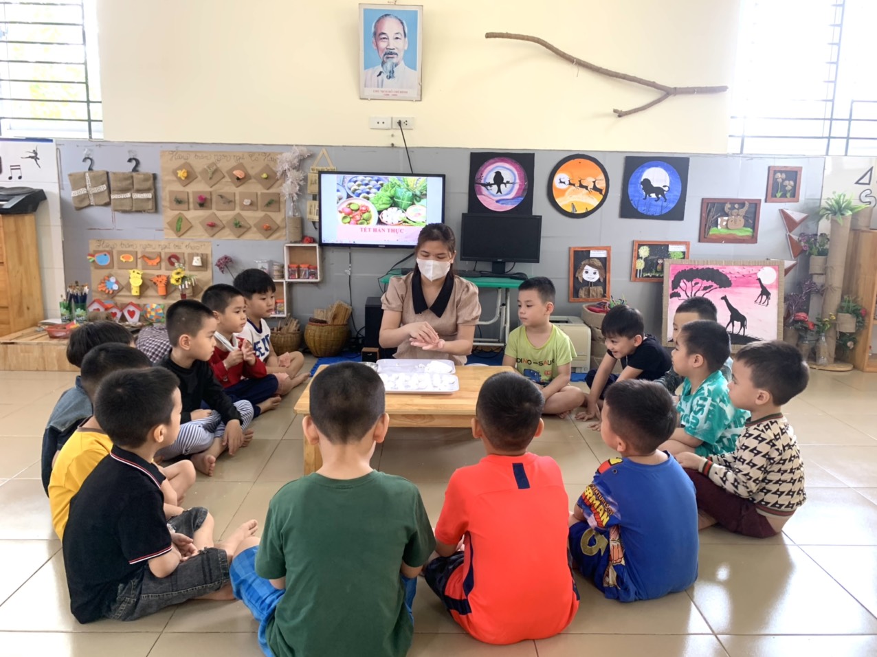 Giáo dục cho trẻ về nét văn hóa truyền thống Tết Hàn Thực của dân tộc Việt Nam các cô giáo đã hướng dẫn trẻ tìm hiểu ý nghĩa của ngày tết và tập làm bánh trôi, bánh chay.