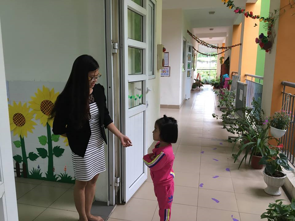 Hình ảnh trẻ thực hành kĩ năng lễ giáo cũng như chào hỏi cô