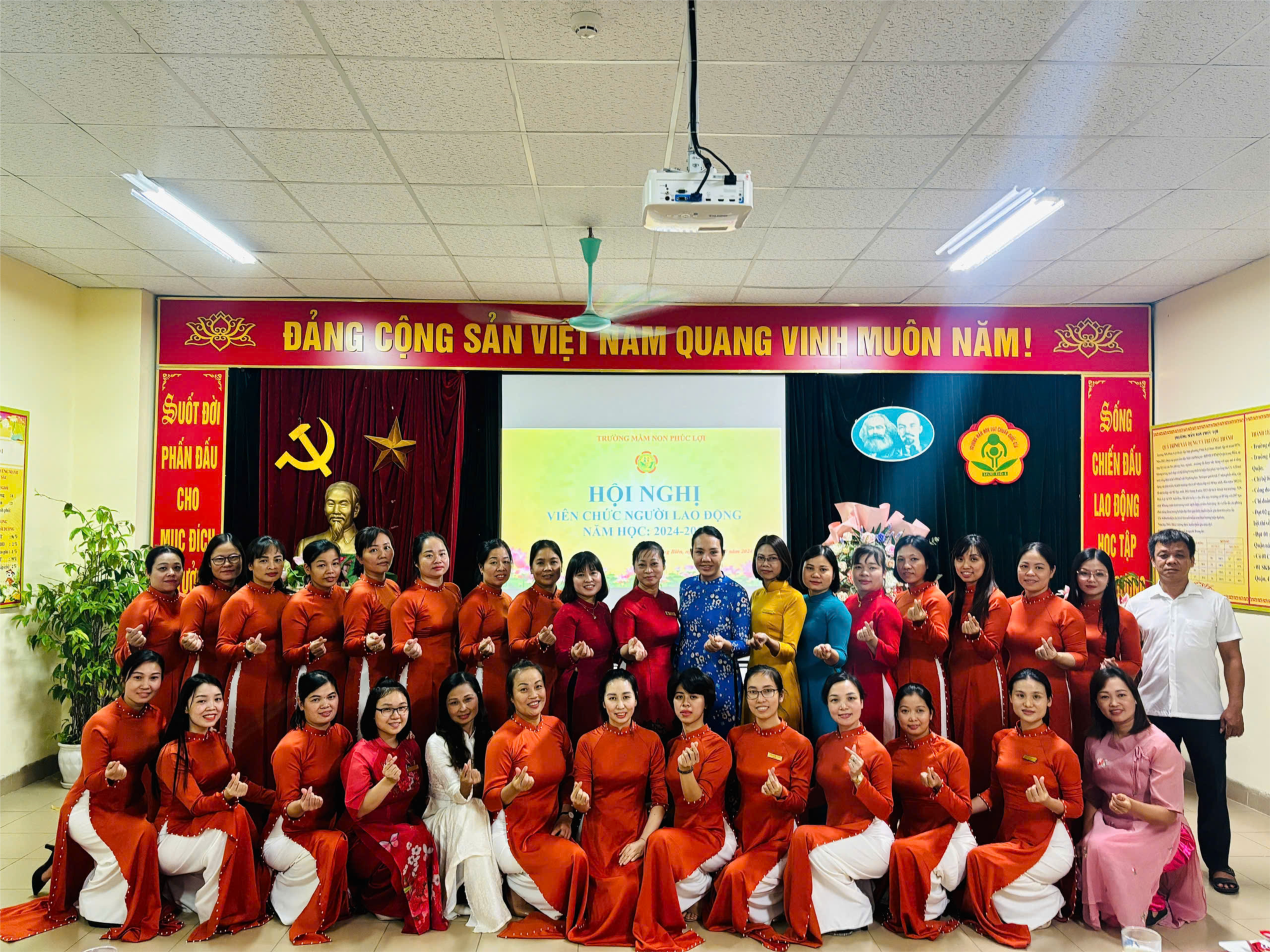 Thực hiện hướng dẫn số 04/HD-LĐLĐ, ngày 13/8/2024 của Liên đoàn lao động quận Long Biên về việc hướng dẫn quy trình tổ chức Hội nghị viên chức và Hội nghị ngừơi lao động khối trường học năm học 2024 - 2025. Chiều ngày 05/10/2024 Trường MN Phúc Lợi đã tổ chức thành công Hội nghị viên chức, người lao động năm học 2024-2025.
