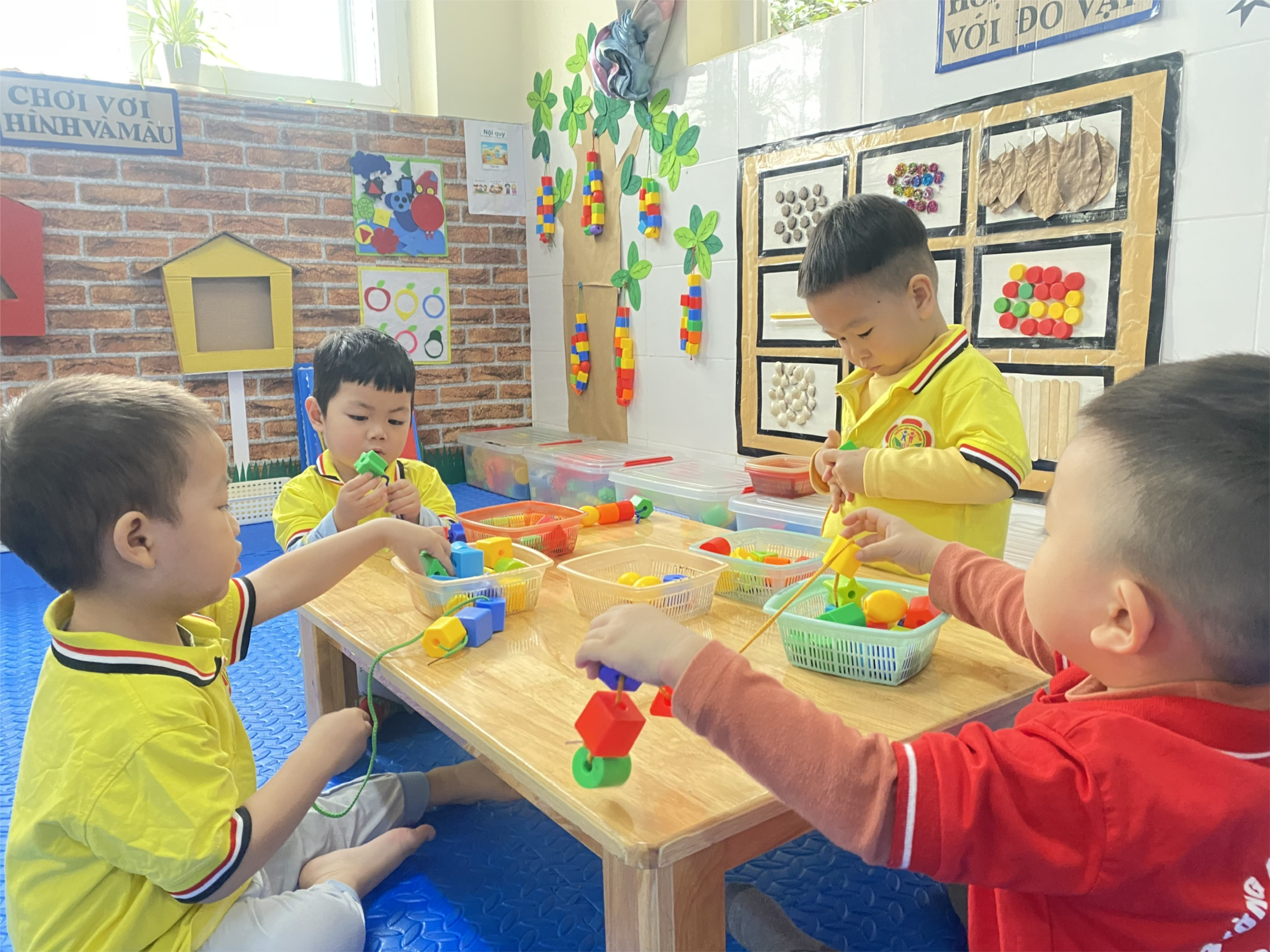 Hình ảnh trẻ chơi tại góc bé chơi với hình và màu