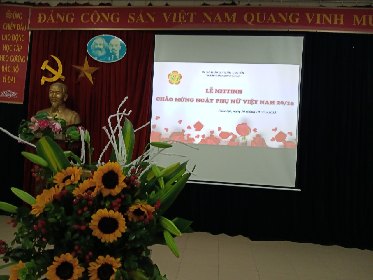 Được sự nhất trí của chi bộ, BGH nhà trường, BCH Công đoàn trường MN Phúc Lợi đã long trọng tổ chức buổi mít tinh kỷ niệm ngày thành lập Hội Liên hiệp Phụ nữ Việt Nam. Tới dự buổi mít tinh có đồng chí Lê Thị Mỹ Hạnh– Bí thư chi bộ - Hiệu trưởng nhà trường. Cùng với đó là sự có mặt của các đồng chí trong BGH, các đồng chí trong Ban chấp hành công đoàn và toàn thể các CBGV-NV.