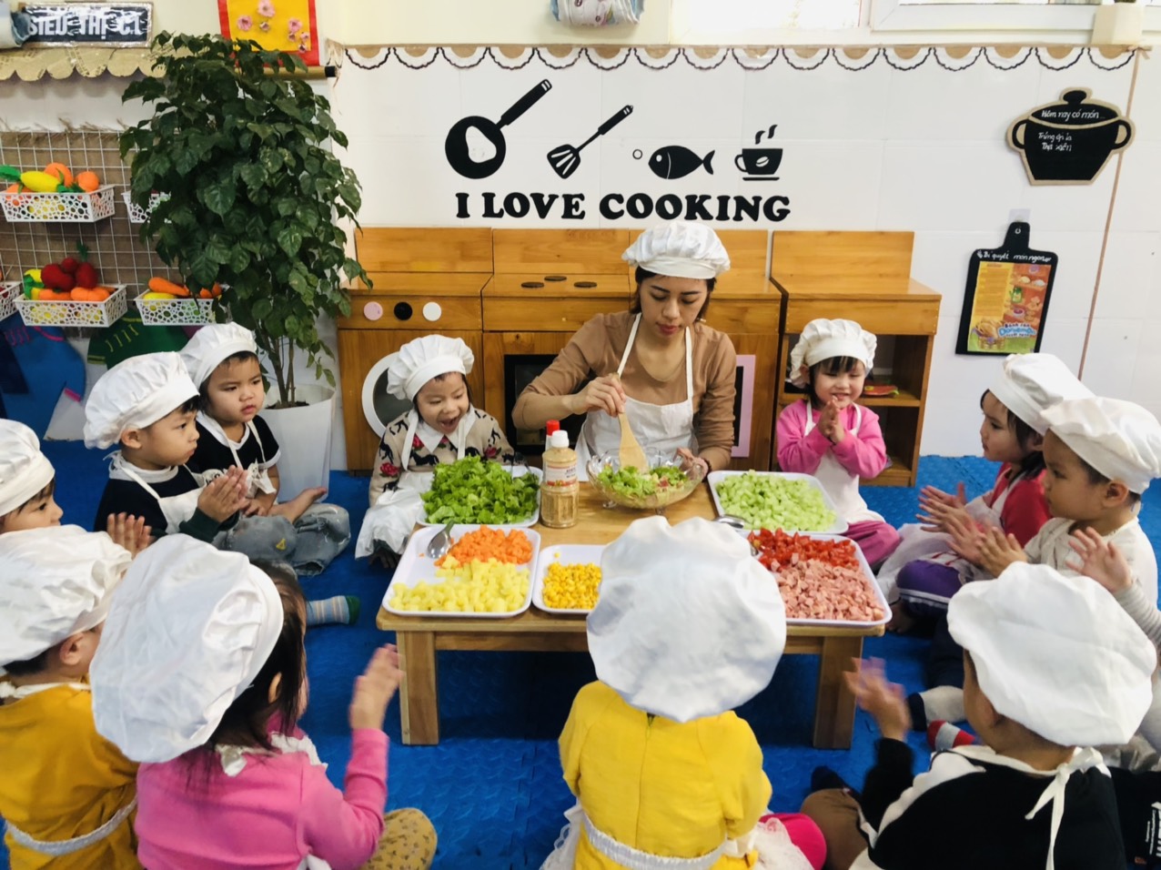 Hôm nay, các bạn lớp mẫu giáo bé C1 được tham gia hoạt động trải nghiệm làm salad rau củ quả. Các bạn rất hào hứng, chăm chú lắng nghe cô hướng dẫn các bước để làm món salad rau củ quả hấp dẫn. Các bé đã điền thêm vào menu của mình thêm một món ăn đơn giản nhưng cũng rất ngon và chứa nhiều chất dinh dưỡng cho bữa cơm gia đình rồi đấy. Hãy cùng các bé lớp mẫu giáo bé C1 thỏa sức đam mê chế biến món Salad rau củ quả nào!