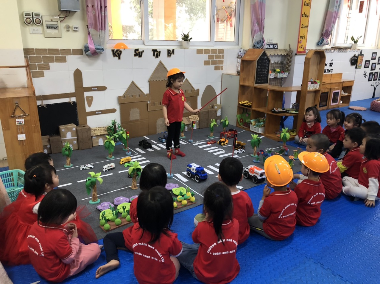 Góc xây dựng: Trẻ sẽ vào vai chú công nhân, những việc làm của trẻ thể hiện rất cần cù, cặm cụi xây dựng ngã tư đường phố. Đồng thời, trẻ biết hợp tác với nhau để thực hiện một công việc được giao.