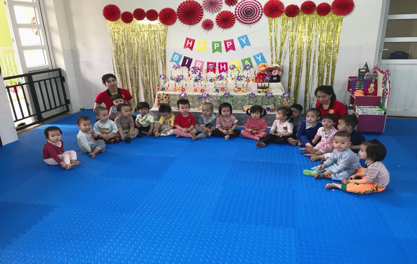 Sau đây là một số hình ảnh các bé lớp nhà trẻ D3 dán trang trí giỏ hoa: