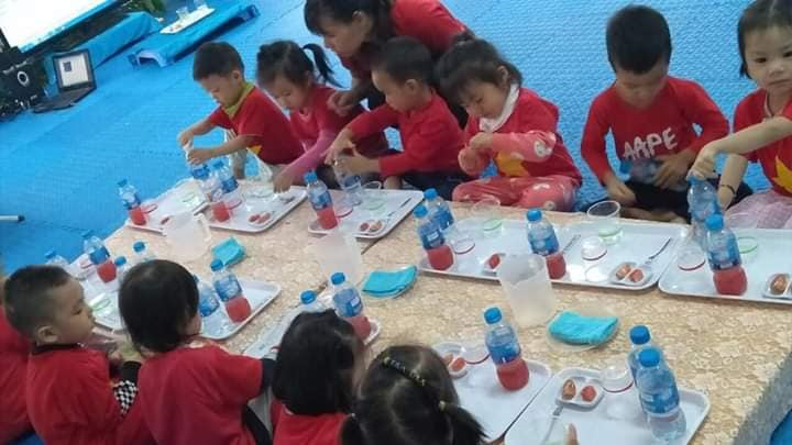 Các cô đã chuẩn bị cho mỗi con một khay đồ dùng trong đó có đầy đủ đồ dùng như cốc,các chai nước màu, chanh,dưa hấu... Các con lần lượt được trải nghiệm rót nước, nếm chanh, pha nước chanh.