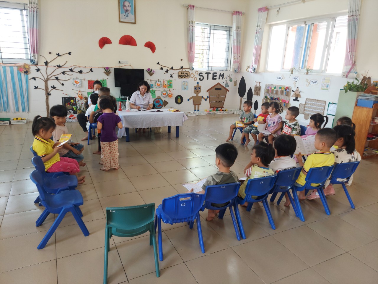 Kết quả khám sức khỏe của trẻ đã được cán bộ y tế phường cùng với giáo viên phụ trách lớp ghi chép cụ thể trong sổ theo dõi sức khỏe, chấm biểu đồ phân loại sức khỏe của trẻ và được giáo viên của lớp thông báo đến phụ huynh cùng phối hợp có biện pháp điều trị kịp thời cho trẻ.