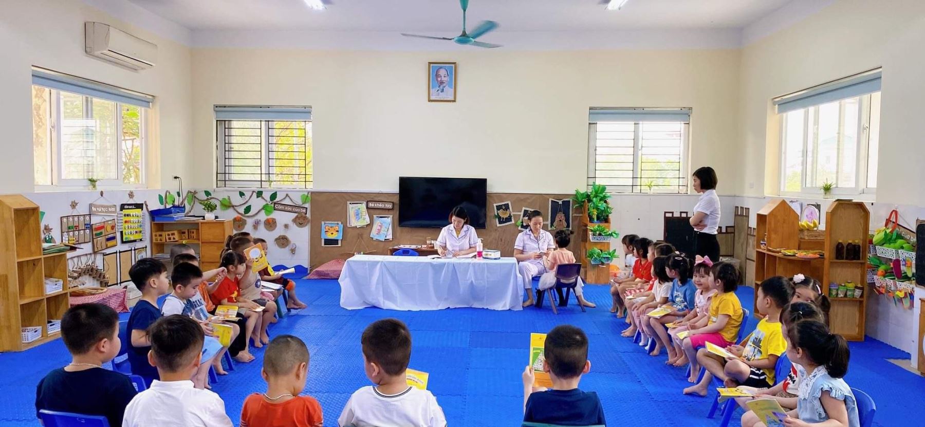 Hình ảnh nhà trường kết hợp với trạm y tế phường khám sức khỏe định kỳ để theo dõi sức khỏe của trẻ