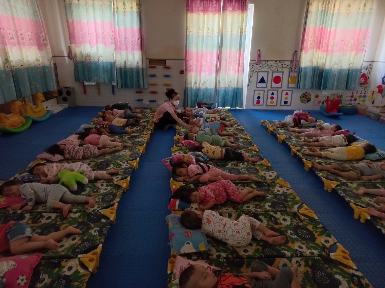 Cô bố trí chỗ ngủ luôn sạch sẽ ,yên tĩnh ,thoáng mát về mùa ,ấm áp về mùa đông. Khi trẻ ngủ cô kéo kín rèm ,tắt hết điện .Trước khi trẻ ngủ cô chuẩn bị đủ giường , gối ,chăn đủ số lượng với trẻ