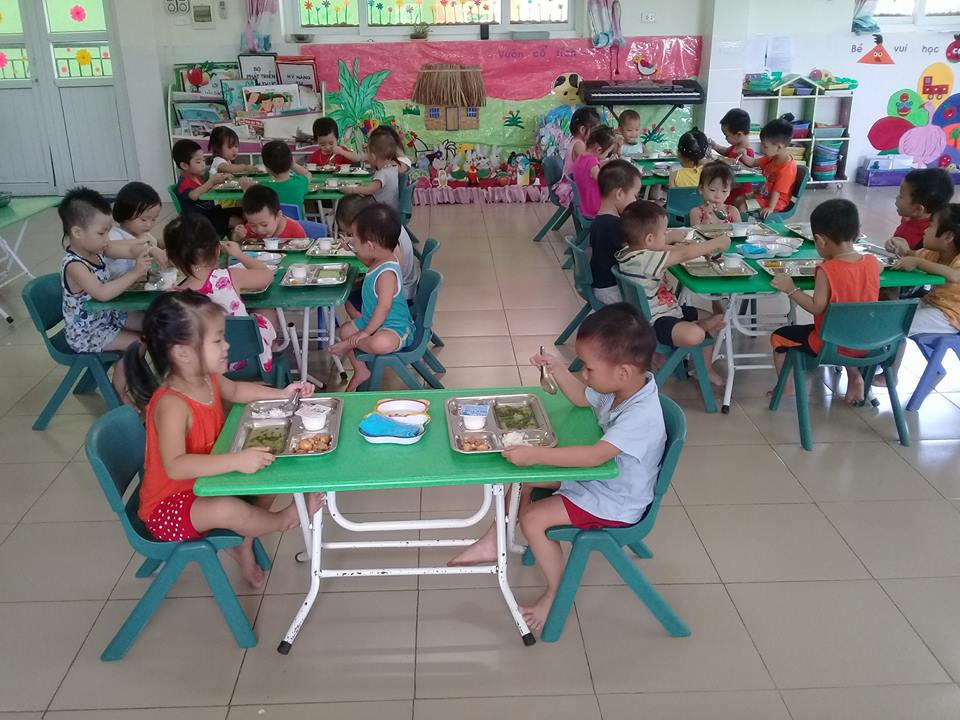 Tại trường mầm non, bữa ăn của trẻ không chỉ đơn giản là thời gian để trẻ ăn mà là tổ chức hoạt động ăn với các bước thực hiện theo các tiêu chí an toàn, sạch sẽ, tạo bầu không khí giúp trẻ ăn hết suất. Trẻ thực hiện theo đúng các quy định trong giờ ăn như: trước khi ăn phải rửa tay, lau mặt sạch sẽ, tự lấy ghế về bàn của mình; các bạn trong tổ trực nhật sẽ giúp cô xếp thìa, khay tại các bàn; trong khi ăn các bạn tự lấy bát của mình, mời cô và các bạn ăn cơm, khi ăn thì giũ yên lặng, ăn hết xuất của mình; sau khi ăn, các bạn tự cất ghế, bát thìa và lau miệng, xúc miệng nước muốn.