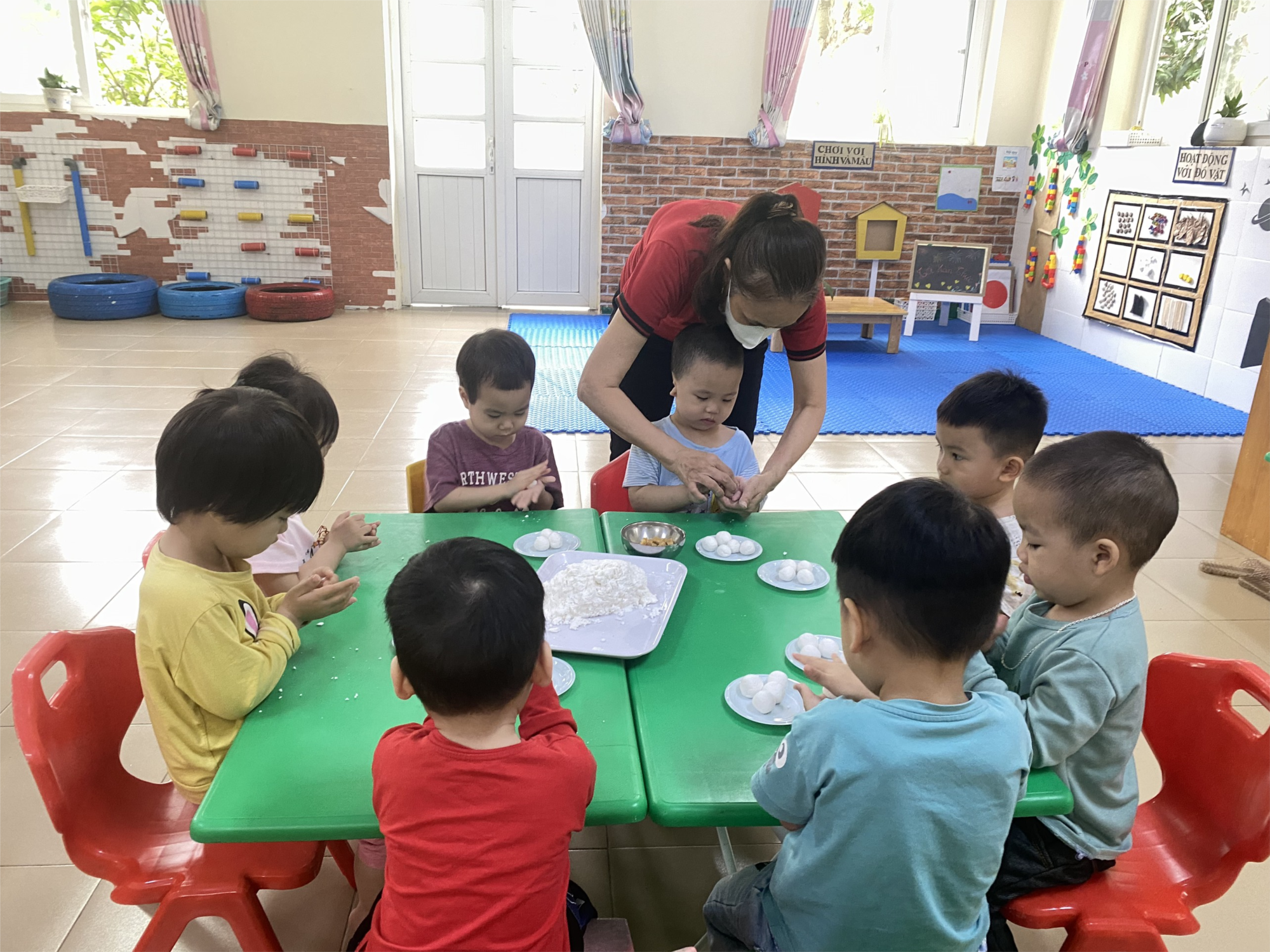 Ngày hôm nay các bạn nhỏ lớp nhà trẻ D2 đã dùng đôi tay nhỏ bé nhưng thật khéo léo để nặn ra những viên bánh trôi. Vỏ bên ngoài trắng bên trong nhân đường đỏ. Các bạn vô cùng hào hứng và được thưởng thức những viên bánh trôi mà do chính tay mình làm ra.