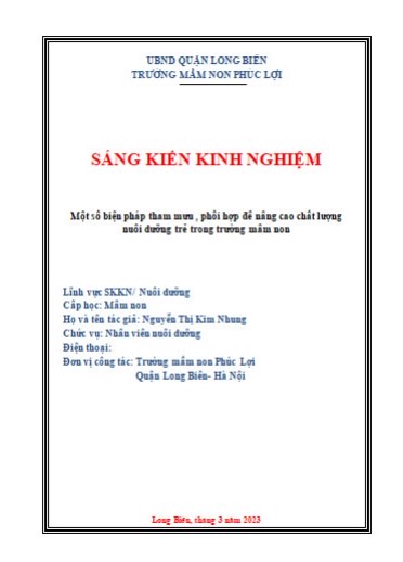 “Một số biện pháp tham mưu, phối hợp để nâng cao chất lượng nuôi dưỡng trẻ trong trường mầm non”. Để áp dụng đề tài đạt kết quả tốt hơn kính mong sự giúp đỡ của cấp trên và các bạn đồng nghiệp.