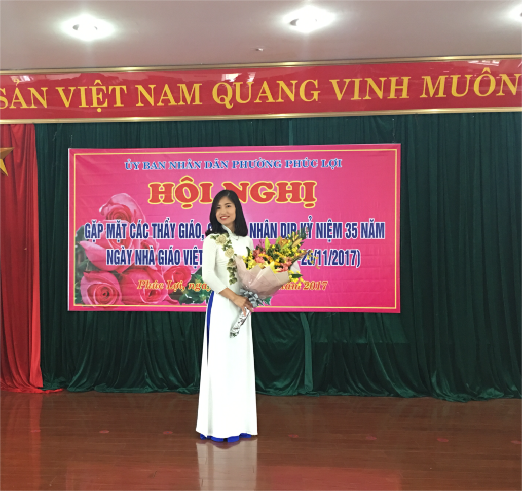 Tôi còn nhớ như in ngày mà chị về trường mầm non Phúc Lợi nhận nhiệm vụ và đúng vào dịp tôi chuẩn bị thi giáo viên dạy giỏi cấp Quận năm 2015. Biết bao sự lo lắng, bỡ ngỡ, và tâm lí sắp phải trải qua cuộc thi. Nhưng khi chị vào lớp quan sát tư vấn về môi trường cũng như tiết dạy, tôi như được tiếp thêm sức mạnh bởi giọng nói hết sức nhẹ nhàng, ngọt ngào và ấm áp “Chào em! Em chuẩn bị đến đâu rồi”, kèm với đó là một nụ cười hiền từ nhìn tôi trìu mến, đã xóa tan trong tôi mọi sự lo lắng và giúp tôi tự tin nói chuyện với chị. Cuối cùng ngày thi cũng đến, trước Ban giám khảo chấm thi tôi rất tâm lý và lo lắng nhưng đã có chị đứng từ xa và động viên “Bình tĩnh, cố lên em nhé” tôi đã thấy tự tin hơn rất nhiều. Hình ảnh ấy mãi mãi theo tôi đên tận bây giờ và sau này vẫn vậy.