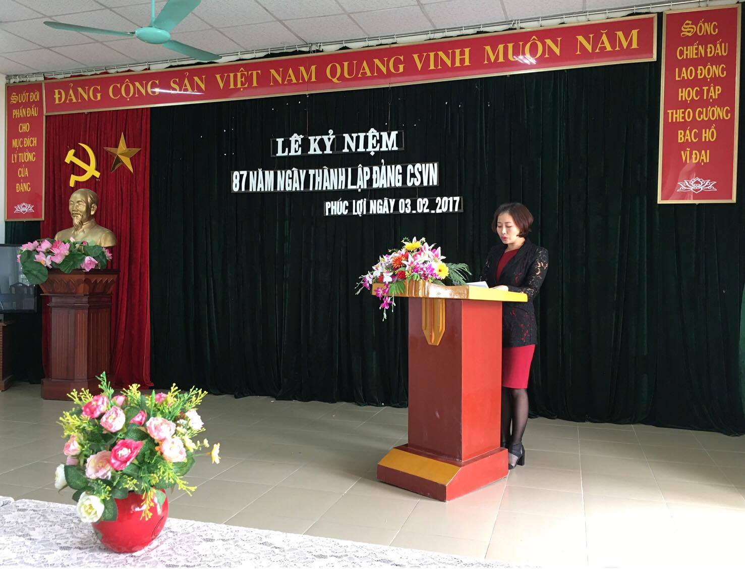 Sáng ngày 03 tháng 02 năm 2017, chi bộ mầm non Phúc Lợi tổ chức " Lễ kỷ niệm 87 năm ngày thành lập Đảng Cộng sản Việt Nam. Dự buổi lễ có đ/c Nguyễn Thị Thanh Hòa- Bí thư chi bộ và các đ/c đảng viên có mặt đầy đủ. Trong không khí trang nghiêm của buổi lễ, các đ/c đảng viên của chi bộ dự lễ chào cờ.