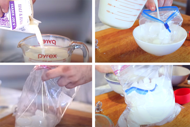 - Sau khoảng 15 phút, có thể mở ra và chất lỏng bên trong túi nhỏ đã cứng lại thành kem. Nếu nhiều nguyên liệu thì có thể cần lắc đến 20-30 phút. Sau đó có thể thưởng thức ngay.