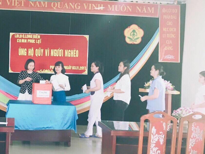 Thực hiện kế hoạch số 51/KH-LĐLĐ ngày 21/9/2017 của LĐLĐ Thành phố Hà Nội; Kế hoạch số 36/KH-MTTQ ngày 28/9/2017 của Ủy ban MTTQ quận Long Biên và Kế hoạch số 54/KH-LĐLĐ ngày 02/10/2017 của LĐLĐ quận Long Biên về Triển khai Tháng cao điểm ”Vì người nghèo” trong CNVCNLĐ quận Long Biên năm 2017, chiều ngày 03/11/2017 Ban chấp hành công đoàn Mầm non Phúc Lợi đã tổ chức phát động trong toàn thể công đoàn trường ủng hộ quỹ “ Vì người nghèo”.