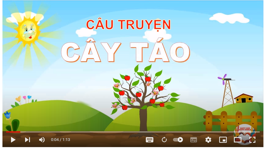 Ông trồng cây táo xuống đất. Bé tưới nước cho cây. Mưa tưới nước cho cây. Mặt trời sưởi nắng cho cây.