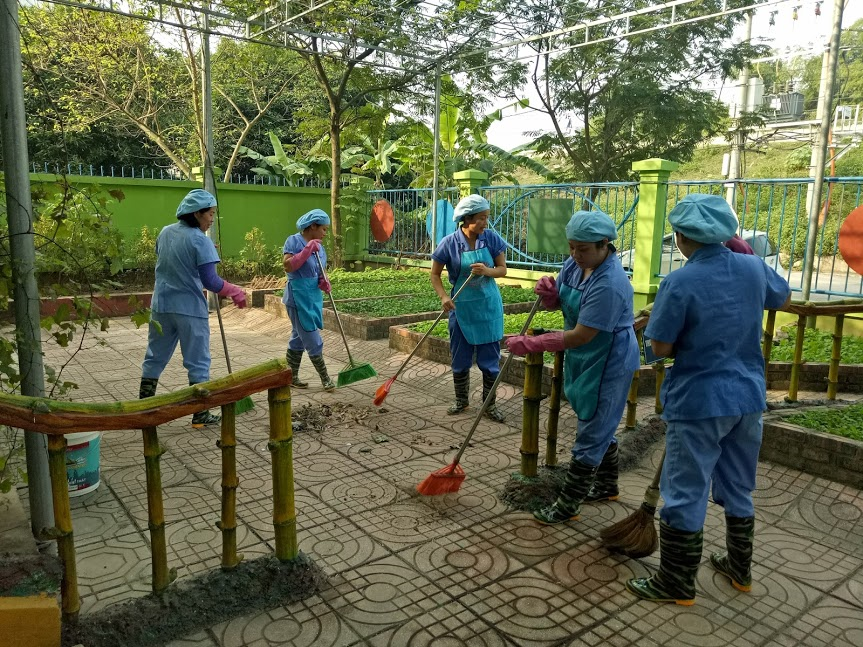 Lịch vệ sinh 1 tuần 1 lần các cô giáo quét lau mạng nhện, bụi cánh cửa, nóc tủ, quạt điện. giặt chiếu, áo gối, phơi chăn , rửa đồ chơi, phơi nắng của lớp mình. Các cô giáo cũng chú ý tới rèn kỹ năng vệ sinh cho trẻ. Ngoài những kỹ năng vệ sinh cá nhân của trẻ, các cô cũng rất chú trọng việc hình thành cho trẻ kỹ năng lao động vệ sinh phù hợp với khả năng của trẻ. Cụ thể đó là những việc nhỏ như lau lá cây, tưới cây và chăm sóc cây ở góc thiên nhiên. Hay có thể là lau giá đồ chơi, sắp xếp đồ chơi trong góc chơi của trẻ. Các cháu Mẫu giáo lớn có thể cùng cô vệ sinh lớp học. Thông qua các buổi họp phụ huynh, các cô giáo cũng tuyên truyền với phụ huynh nhiệm vụ bảo vệ môi trường khi gửi con đến trường như: không xả rác bừa bãi, hướng dẫn con vứt rác đúng nơi qui định khi chơi ở ngoài sân trường, để xe gọn gàng không gây cản trở giao thông...